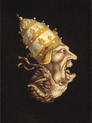 Mooie voorbeelden hiervan uit deze tijd van de godsdienstoorlogen vinden terug op contemporaine spotprenten. Zo zien we op de ene prent de paus in een soort januskop met de duivel. Op de andere prent zien we hoe de grote hervormer Maarten Luther - in de hoedanigheid van een duivelse doedelzak - 'zegt' wat de duivel hem als het ware inblaast.